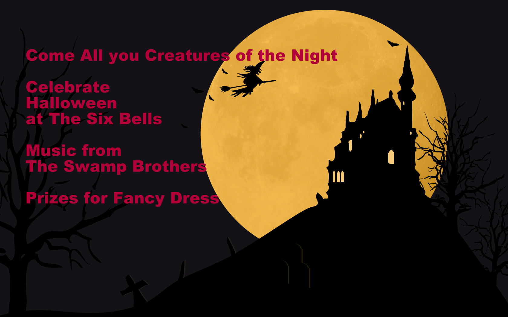 ♫ O yea! Creatures of the Night! Hear ye the sounds of The Swamp Brothers on the great night of Hallowe’en who will be playing haunting hillbilly, bewitching bluegrass and creepy country blues down at The spellbinding Six Bells! And so, you vampires, witches, ghosts, zombies and werewolves etc. if you fancy sharpening your fangs, stirring the cauldron, floating around ethereally, slurping at something tasty or howling at the moon and so on whilst listening to thrilling tunes then then c’mon down for an eerie – and entertaining evening! (‘;..;’) ♬