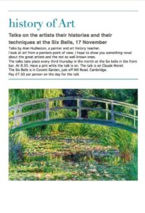 The latest in our series of history of art talks this month’s subject is Claude Monet. Just come along on Thursday evening, no need to book